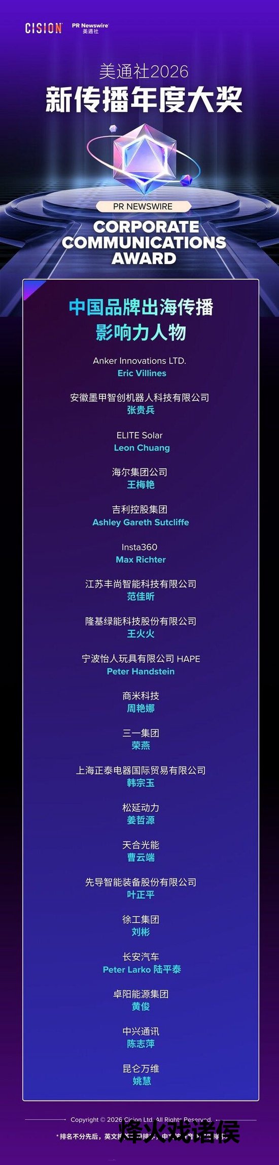 论坛结束后,2026美通社新传播大奖获奖名单揭晓。本次大奖共设19个奖项类别,涵盖内容策略、内容制作、品牌影响力、海外传播、多媒体传播、传播洞察、团队贡献等领域,全面展示了2025年度企业传播领域的卓越成果。获奖名单见下图: